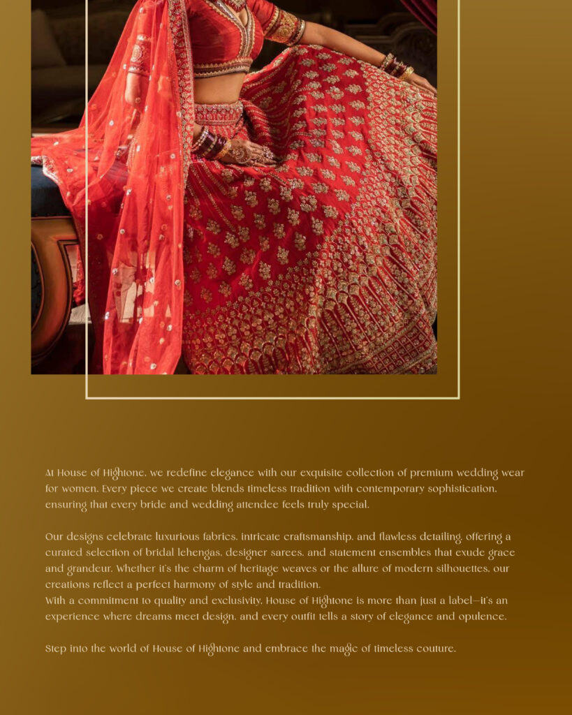 At House of Hightone, we redefine elegance with our exquisite collection of premium wedding wear for women. Every piece we create blends timeless tradition with contemporary sophistication, ensuring that every bride and wedding attendee feels truly special. Our designs celebrate luxurious fabrics, intricate craftsmanship, and flawless detailing, offering a curated selection of bridal lehengas, designer sarees, and statement ensembles that exude grace and grandeur. Whether it's the charm of heritage weaves or the allure of modern silhouettes, our creations reflect a perfect harmony of style and tradition.